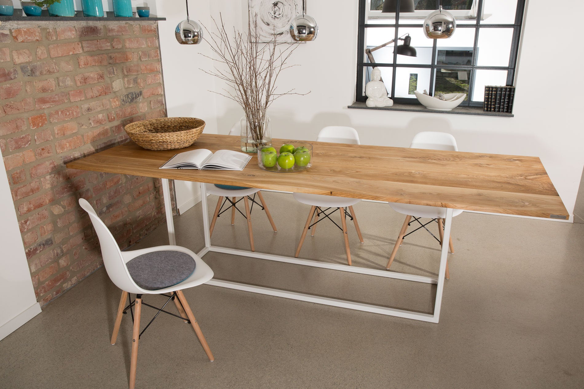 Massivholztisch aus belgischer Eiche mit sehr schöner und lebhafter Holzstruktur. Die Äste und Risse sind mit Epoxidharz vergossen und die Oberfläche ist mit einem matten Lack gegen die tägliche Beanspruchung geschützt. Das Gestell ist anthrazit grau pulverbeschichtet. Der Preis bezieht sich auf eine Plattengrößen on 200x90cm und eine dicke von 2,5cm.